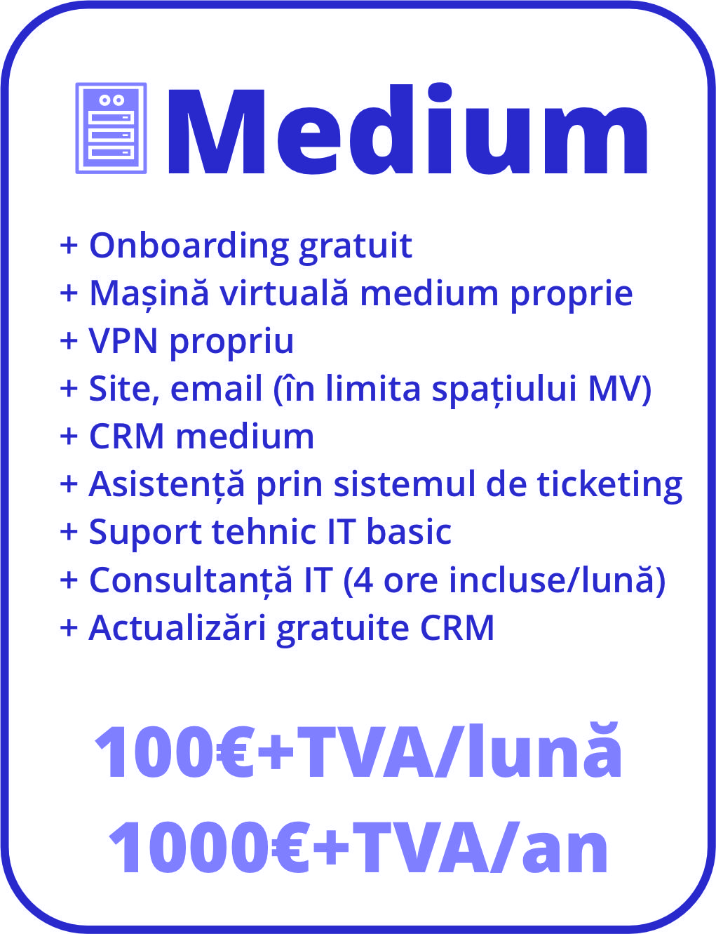 CRM-ul nostru simplu de utilizat vă ajută să gestionați relațiile cu clienții, facturarea și proiectele, în timp ce soluțiile noastre de securitate cibernetică asigură protecția datelor dumneavoastră împotriva amenințărilor online. Alegeți Cyber Plus pentru a beneficia de expertiza noastră în domeniul IT și pentru a vă duce afacerea la următorul nivel.